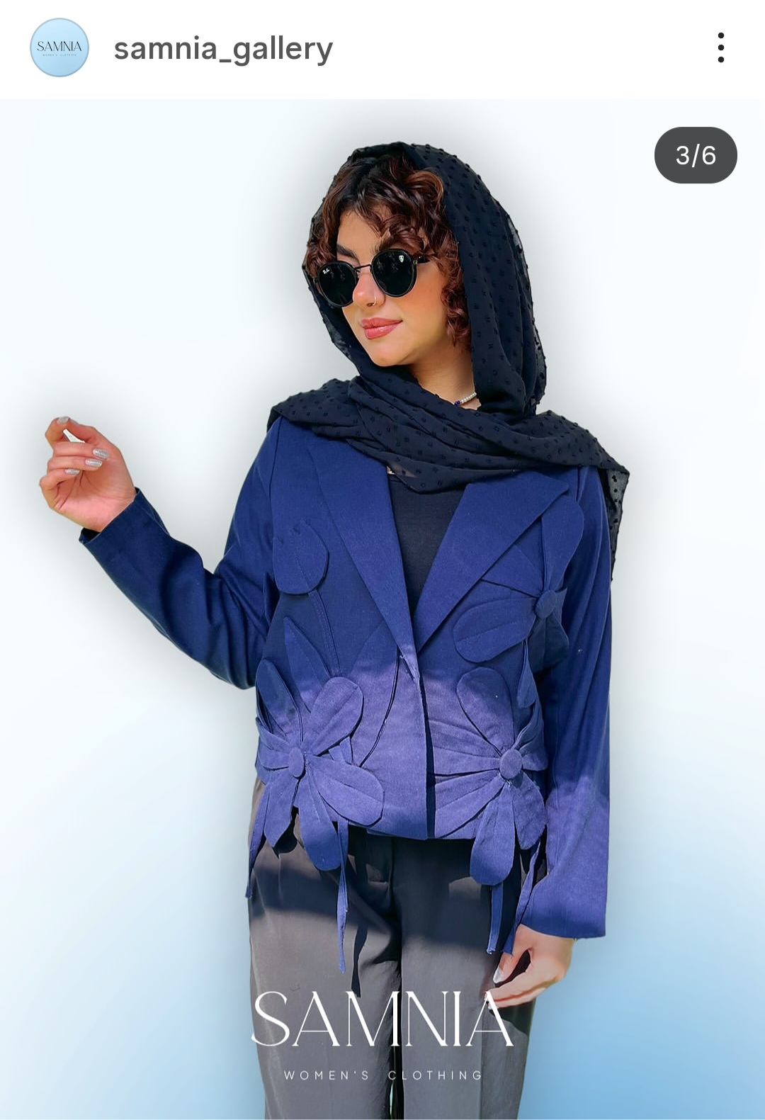 این کت زنانه شیک و کوتاه از برند "سامنیا" به رنگ آبی تیره (احتمالاً سرمهای) طراحی شده و دارای سبکی نیمهرسمی تا مجلسی است. بارزترین ویژگی این کت، تزئینات برجسته و سهبعدی گُلمانند است که با مهارت روی پارچه بریده شده و در قسمت سینه و پایین کت به کار رفته و جلوهای خاص و هنری به آن بخشیده است. برش کت کوتاه بوده و یقه آن به سبک بلیزر، تیز و رسمی است، اما جزئیات گُلدوزیشده از خشکی آن کاستهاند. این مدل معمولاً با یک بلوز تیره (مشکی) و شلوار راسته یا نسبتاً گشاد همرنگ (مانند مشکی یا خاکستری تیره) ست میشود و برای مجالس، مهمانیها یا استایلهای خاص و مد روز بسیار مناسب است.
