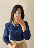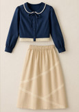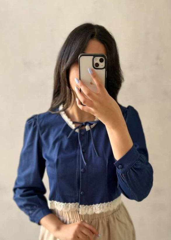 این مجموعه لباس دو تکه زنانه، نمایانگر سبکی کلاسیک، شیک و فانتزی است که بهویژه برای دختران جوان یا طرفداران استایلهای وینتیج مناسب میباشد. بلوز بالاتنه که به صورت کراپ کوتاه طراحی شده، با یقه پیترپن (گرد) سفید و حاشیه توری ظریف در لبه پایین، تضاد زیبایی با رنگ سورمهای تیره آن ایجاد کرده است. آستینهای پفدار با سرآستین جمع شده و همچنین وجود یک بند پاپیونی ظریف زیر یقه، بر جزئیات دخترانه این طرح تأکید دارند. بخش دوم، یک دامن بلند و گشاد به رنگ کرم روشن است که از پارچهای خنک دوخته شده و با نوارهای مورب و تزیینی از تور یا گیپور همرنگ تزئین شده که این تزئینات، سادگی دامن را شکسته و هماهنگی کاملی با تزئینات توری کراپ ایجاد کرده است.